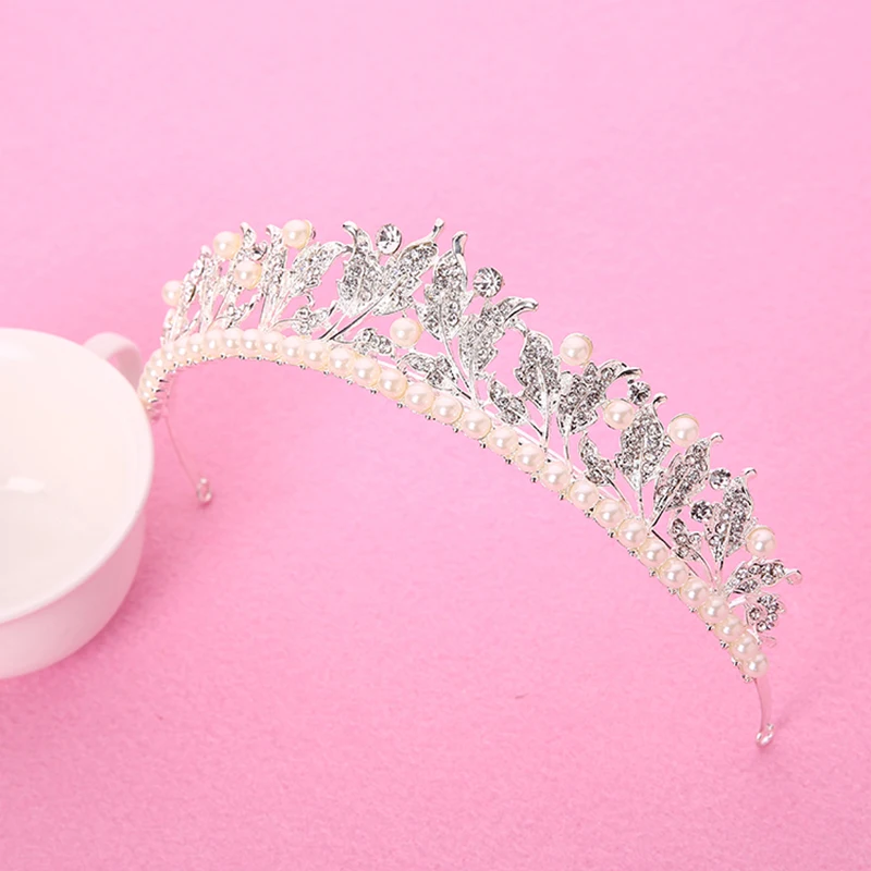 Elegant Hairband Women Simulated Pearl Crown Crystal Tiara Gold Silver Plant Head Jewelry Bridal We